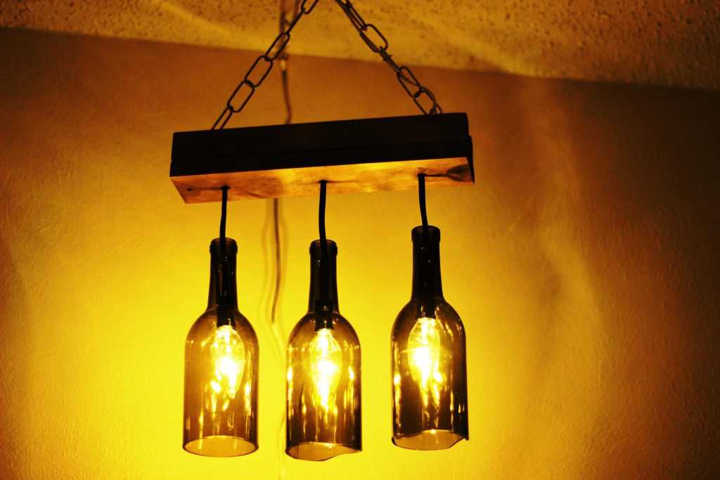В список необходимых приспособлений входят кусачки, шуруповерты, шурупы, стеклорез, силикон, тряпка или кисть, морилка, сосновые доски, крючки, цепь, десять лампочек, разводка, бутылки из-под вина. Первым делом обрабатываются емкости. С бутылок снимаются этикетки и остатки клея. С помощью стеклореза нужно убрать дно у каждой бутылки: он упирается на высоте 1—2 см, а бутылка крутится вокруг своей оси. Трещины необходимо обстучать молотком, пока дно не отпадет. После этого электропровода помещаются в бутылки и соединяются с патронами. В них вкручиваются лампочки. Теперь нужно готовить доски. В нижней, большей, сверлятся дырки для горлышек и проводов. Верхняя соберет их в один пучок. В нижнюю доску вкручиваются крюки для цепей, которые будут удерживать конструкцию. Для кухни можно сделать настольный светильник с основанием из бутылки и плафоном из дерева.