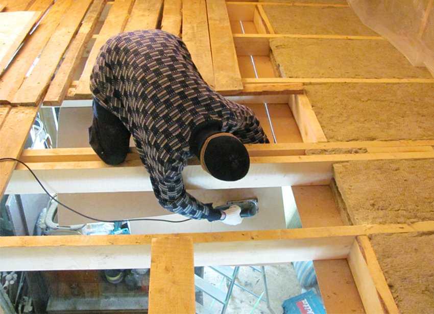 - Далее со стороны потолка нижнего этажа набиваются доски. Эта черновая отделка потолка становится основой для дальнейшей укладки слоев «пирога».
