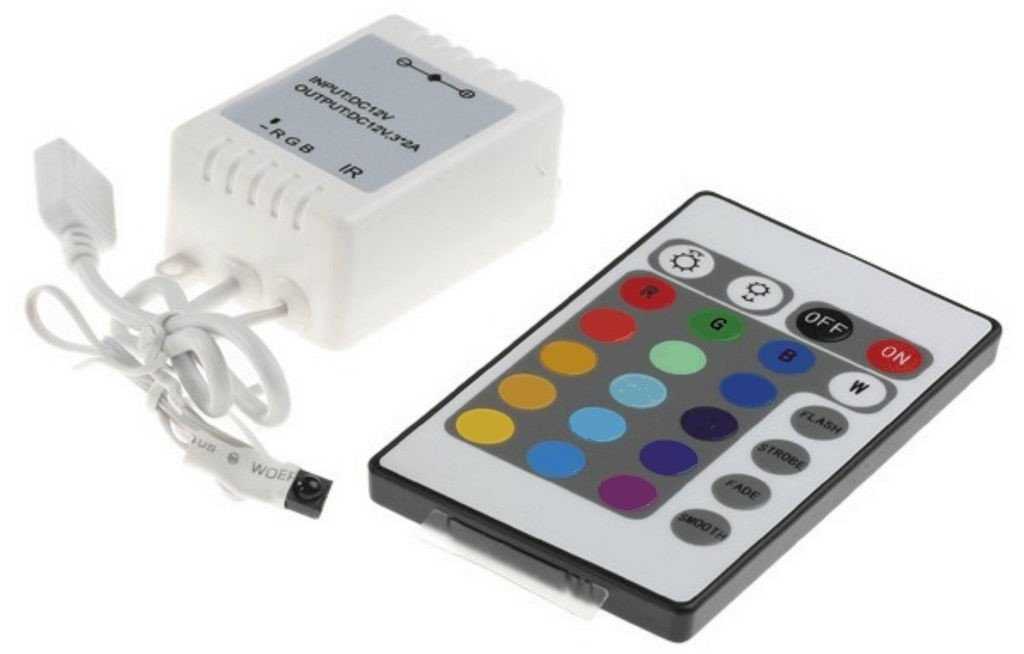 В тех случаях, когда необходимо обеспечить несколько режимов работы светодиодной ленты (изменения яркости свечения, мерцание или работа в режиме елочной гирлянды) используется контроллер. Это небольшое устройство состоит из корпуса, в котором расположены элементы его электрической схемы, штекера для подключения светодиодной ленты, а также датчика, позволяющего управлять работой контроллера с пульта дистанционного управления.