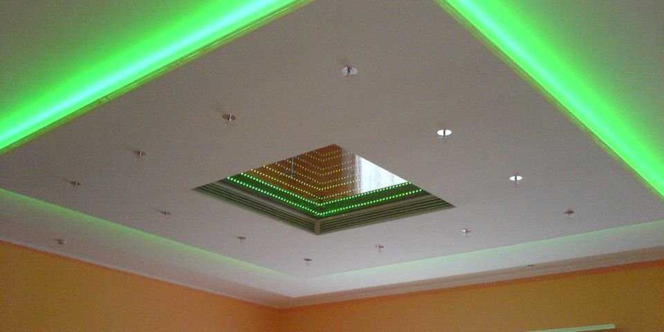 Установка ленты между материалом покрытия и основанием создает иллюзию свечения изнутри. Сложным приемом является создание дизайнерской подсветки посредством ленты внутри натяжного потолка. Нередко для таких систем используют дополнительные нити с источником свечения на концах волокон.