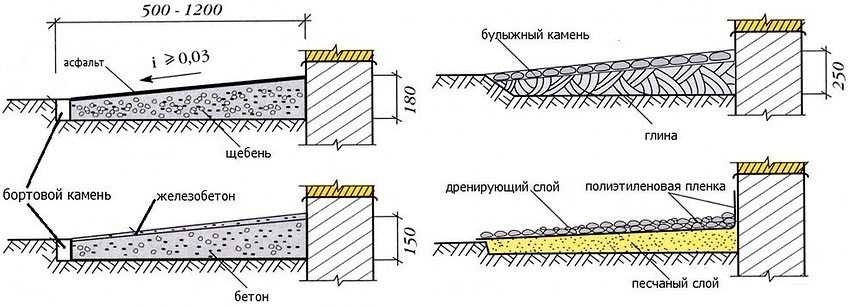 Отмостки могут иметь разную конструкцию, а для их изготовления использоваться различные материалы.