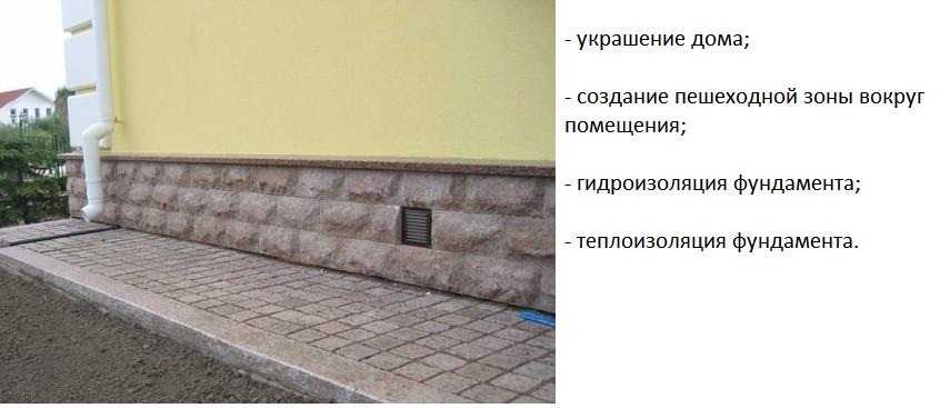 В первом случае, ее полоса по всему периметру дома имеет твердое, водонепроницаемое покрытие. Во втором варианте, гидроизоляция находится внутри конструкции, а верхнее покрытие выполняется из водопроницаемых материалов, которые обеспечивают декорирующую функцию.