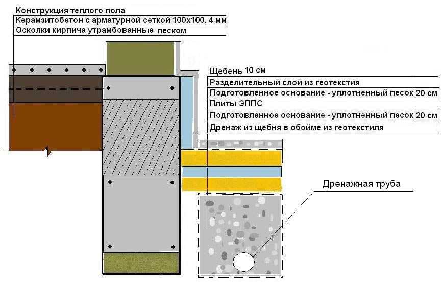 Существует мнение, что утепление такой конструкции можно обеспечить, засыпая в нее вместо щебня слой керамзита. Это мнение не совсем верно. В слое насыпного керамзита остаются воздушные зазоры, в которых через время скопится влага, а теплоизоляционные свойства такого слоя сильно снизятся. Если же использовать керамзитобетон, то необходимая толщина слоя будет очень большой и вся экономия пропадает.