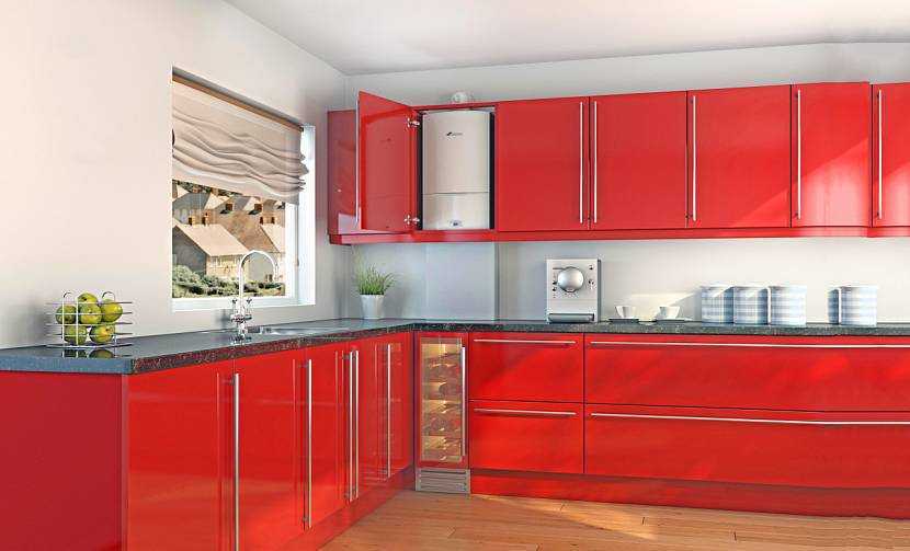 - Установка газового котла в кухонном гарнитуре также оговаривается правилами. Прибор при работе нагревается, поэтому расстояние до боковых стенок не может быть меньше 5 см, до дверцы маскировочного шкафа — минимум 10 см.