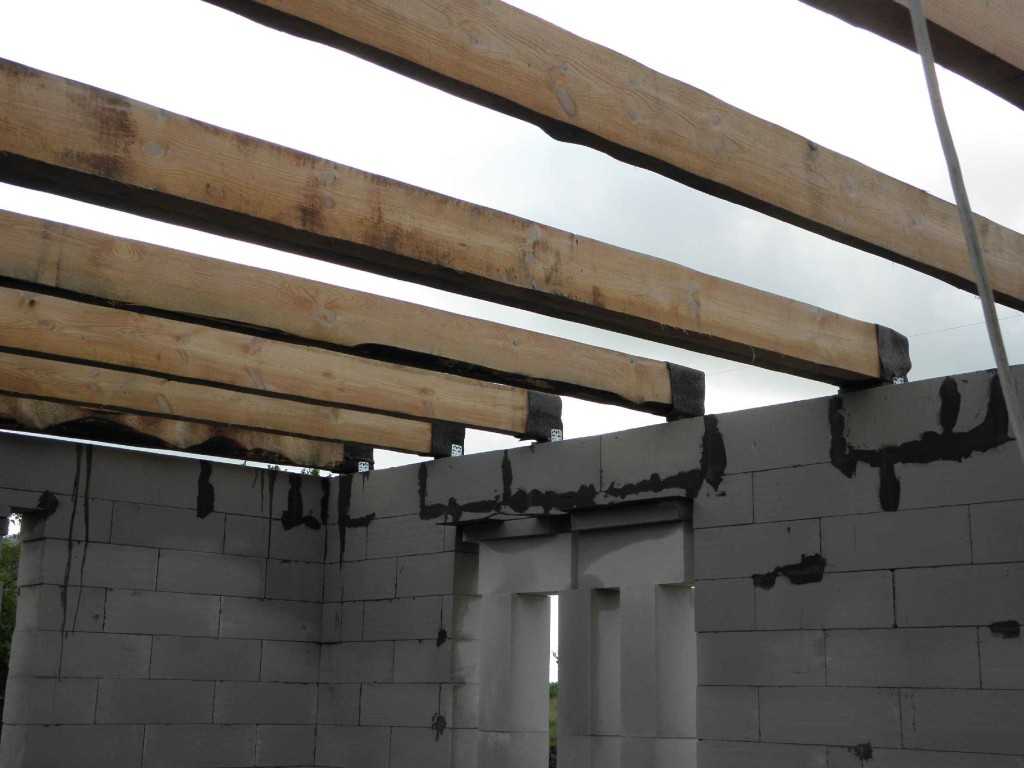 - Это один из способов формирования свеса кровли. В другом варианте, балки бесчердачного перекрытия могут монтироваться непосредственно к мауэрлатному брусу – что мы и видим на фото снизу. Естественно, длина балок при одинаковом пролёте, в таких ситуациях будет разной, и при расчёте составляющих элементов перекрытия, все эти нюансы должны быть учтены.