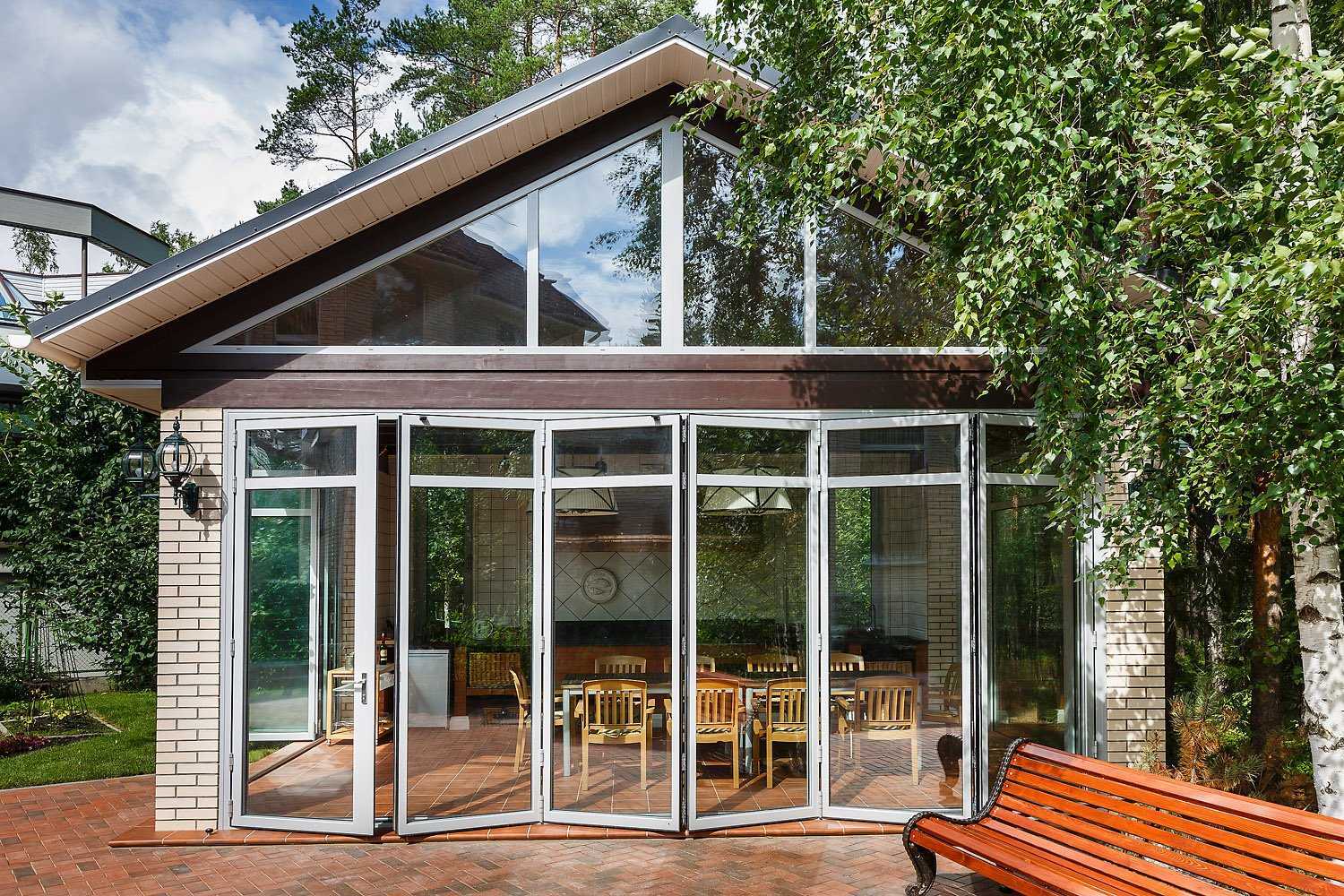 - Складная / раздвижная стеклянная дверь для веранды, террасы, беседки, которая экономит пространство.