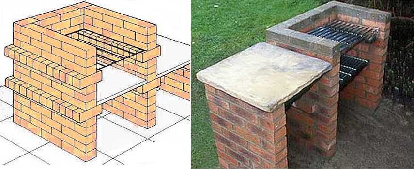 Эта конструкция очень проста, легко изменяется под любые потребности и желания. Состоит из кирпичных стенок, в которых устроены выступы (кирпич положен на ребро). На эти выступы укладываются жаропрочные листы (металл и др.), решетки, шампура. Удобно, особенно если есть какая-то крыша над головой на случай осадков, но строится она отдельно и по желанию.