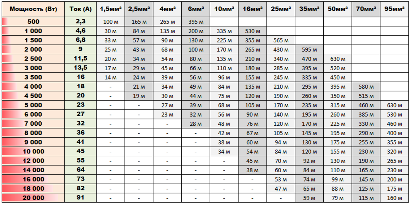 Когда вы выберите материал для кабеля, можно рассчитать нужный диаметр его жил. Делают это с учетом будущей нагрузки, которую просчитывают по специальной таблице.