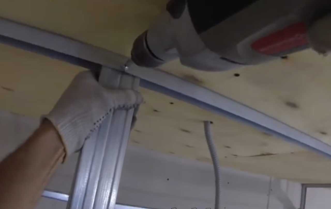 - далее можем крепить направляющие к стенам и потолку. При угловой конструкции, направляющие крепятся к стенам и углу;