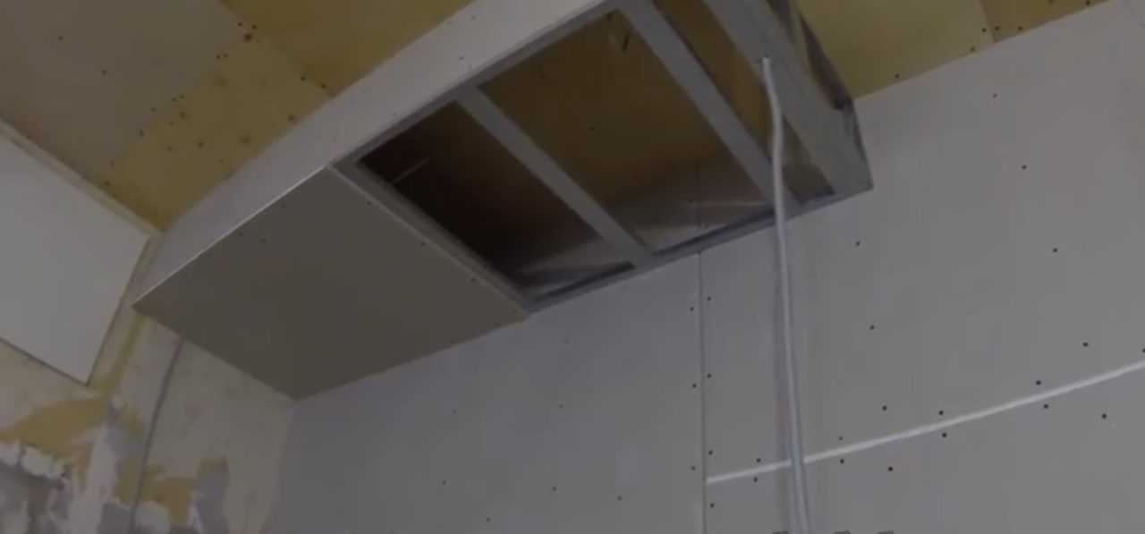 - Как плавило, вешать кухонные шкафы нужно под потолок, поэтому иногда закрепляется каркас прямо на гипсокартонной стене.