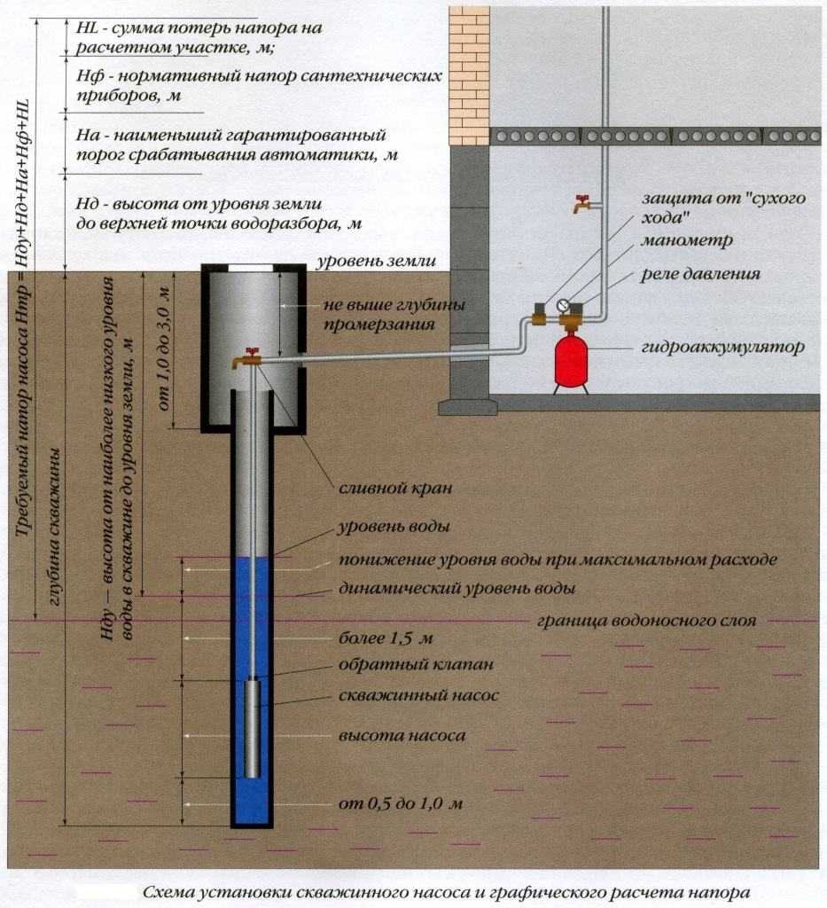 Прежде чем приобрести агрегат необходимо своими реками произвести измерения объема слоя воды в источнике и глубину скважины. Сделать это можно простым средством измерения: на конец веревки привязывается грузик и опускается в скважину. На фото изображена схема монтажа глубинного насоса.