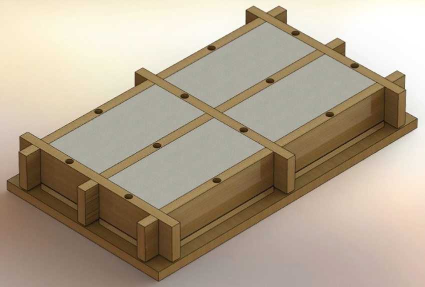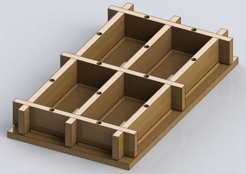 Наличие днища необходимо для создания возможности переноса заполненного шаблона на стеллаж (чтобы, например, подождать твердения бетонной смеси). Соединение брусков можно выполнить без устройства пазов, с использованием крепежа, но тогда разборка конструкции в случае необходимости будет затруднена.