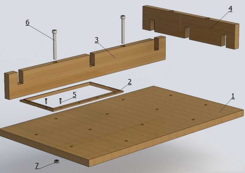 1 — основа, 2 — вставка, 3 — продольная стенка, 4 — поперечная стенка, 5 — шуруп, 6 — винт, 7 — гайка.