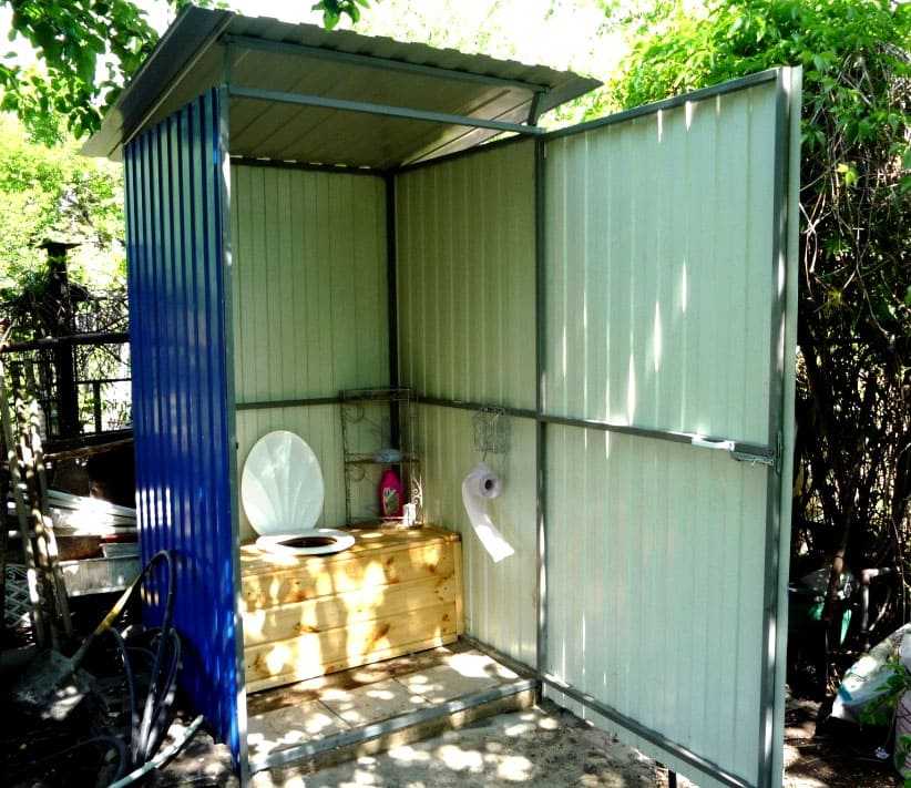 Данный вариант дачного туалета подойдёт для тех, кто имеет ограниченный бюджет и хочет соорудить его по-быстрому. Для строительства используют металлические листы, которые, возможно, остались после возведения дома, или покупаются новые