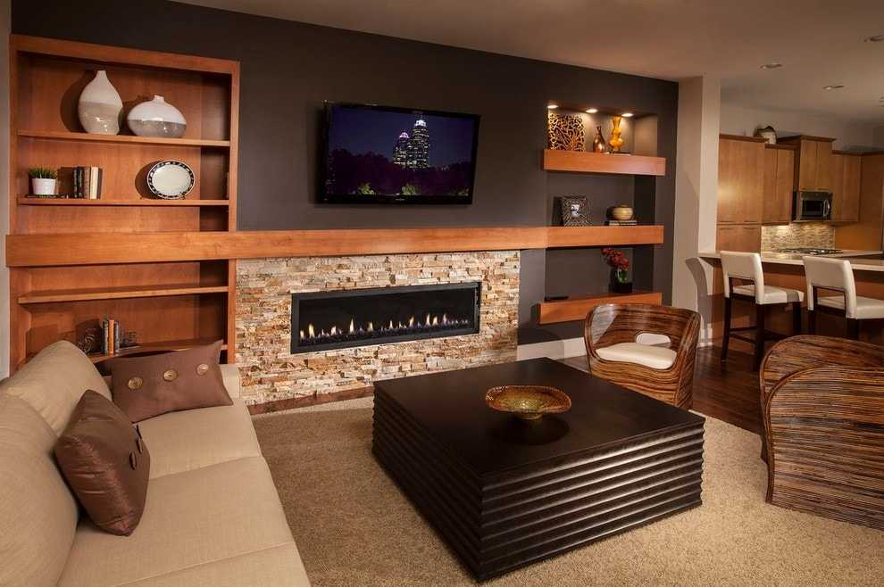 важно, чтобы камин и телевизор гармонично смотрелись на общем фоне гостиной;