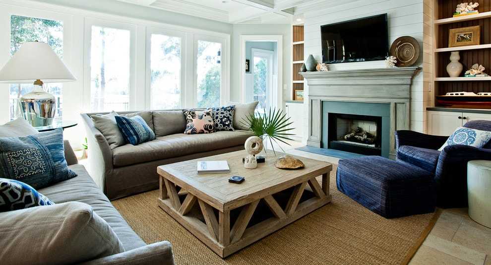 Если вы все-таки приняли решение совместить камин и телевизор, тщательно продумайте обстановку и все детали интерьера.