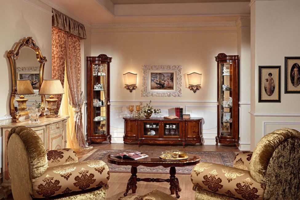 Классический стиль предполагает наличие различных завитков, узоров и лепнины. Форма строго прямоугольная. Портал выполнен из обработанного дерева, гипса или мрамора.