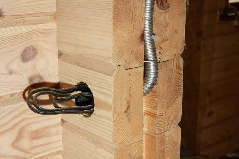Применение накладных электоустановочных изделий чаще всего связано с устройством проводки в загородных домах, стены которых сложены брусом, обычным или оцилиндрованным бревном. Правда, скрытая прокладка кабеля в выдолбленных в древесине каналах допустима, если кабель проводка протянута через невозгораемые гильзы.
