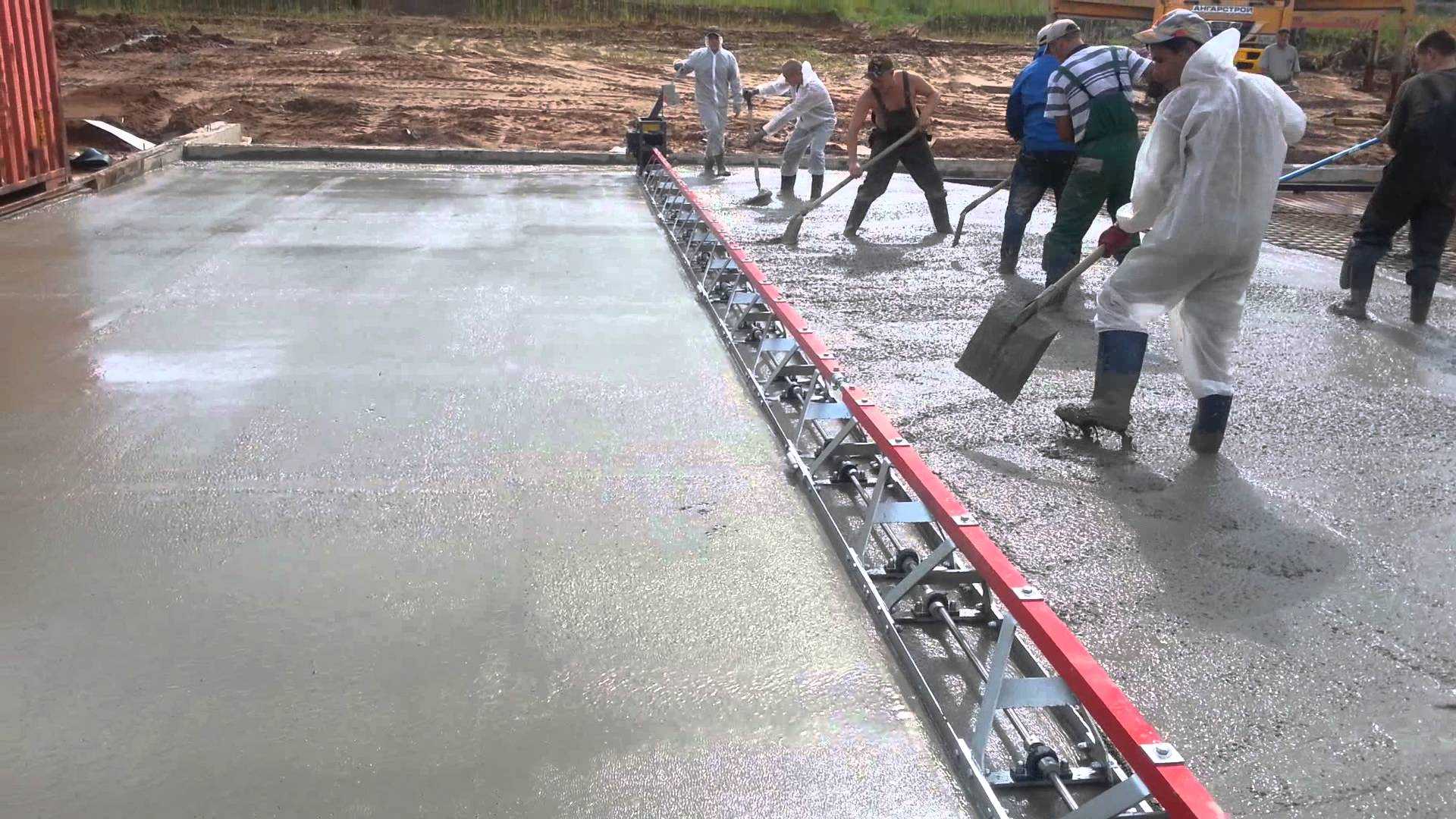 При помощи направляющих выравнивается верхний слой покрытия из бетона.