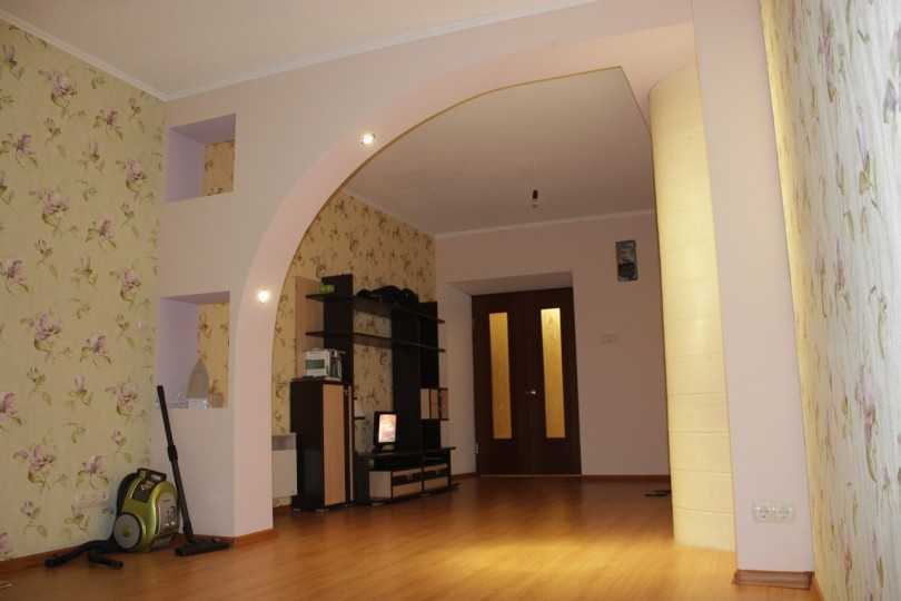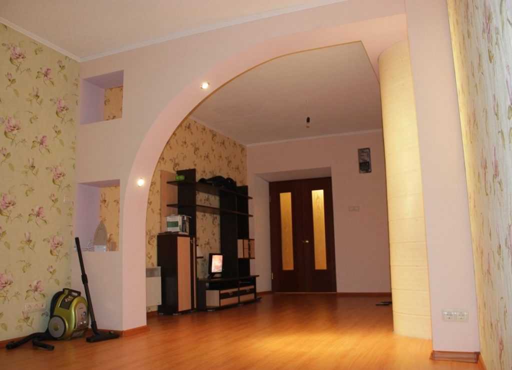 Арка в зал должна быть широкой, только тогда достигается эффект расширения пространства и комната выглядит роскошно и гармонично. Так как наши стандартные проемы узкие, то для создания арки для зала придется этот проход расширять.
