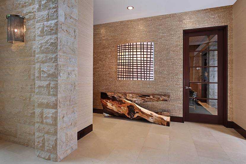Натуральный камень отличается долговечностью. В интерьере данный материал выглядит естественно за счёт своего природного происхождения. Однако натуральный камень стоит недёшево, из-за чего он обычно встречается снаружи здания либо в богатых и изысканных интерьерах.