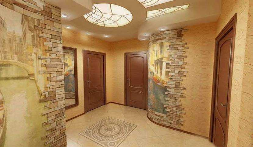 - Декор искусственным камнем в прихожей становится своеобразной классикой, он придает интерьеру особое очарование, статусность и роскошь. Он не боится перепадов температур, поэтому даже промерзающие стены у входной двери не испортят впечатление от дизайна интерьера, оставаясь наиболее практичным вариантом. В коридорах и на углах применяют «рваную» или сплошную облицовку.