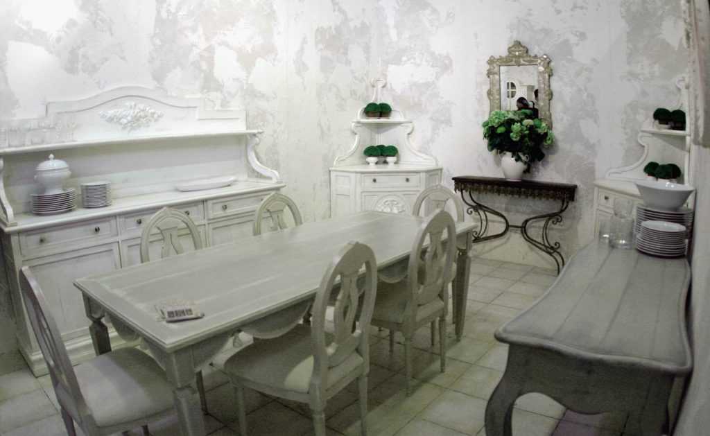 Пастельные оттенки, белые потолки. В интерьере прослеживается четкая симметрия. Потолки могут быть украшены лепниной, широкими багетами. Слишком яркие краски не приветствуются, основные оттенки бежевые, светло-желтые, светло-серые, светло-голубые, нежно-розовые. Можно сочетать два вида штукатурок — гладкую матовую как основной фон и фактурную как панно в багете на стене.
