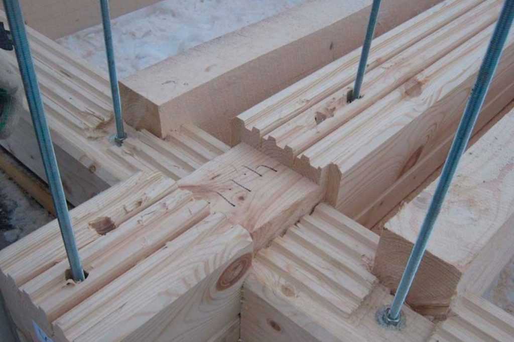 Скрепка брусьев между собой осуществляется с помощью металлических нагелей, которые забиваются в шахматном порядке.