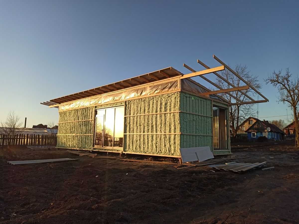 Далее строители вырезали и усилили оконные и дверные проемы по проекту. Стены и крышу снаружи утеплили напыляемым пенополиуретаном. После этого установили окна и двери.