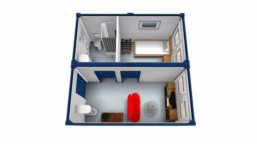 Жилище, состоящее из одного блок контейнера, может вместить все необходимое для проживания. Просторным назвать его нельзя, но при необходимости получить компактный и экономичный дом, это наиболее приемлемый вариант.