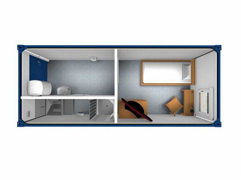В стандартном контейнере среднего размера умещается полноценный санузел, кухонная зона и спальня. Данный тип жилья идеален для строительства бюджетных гостиниц и общежитий.