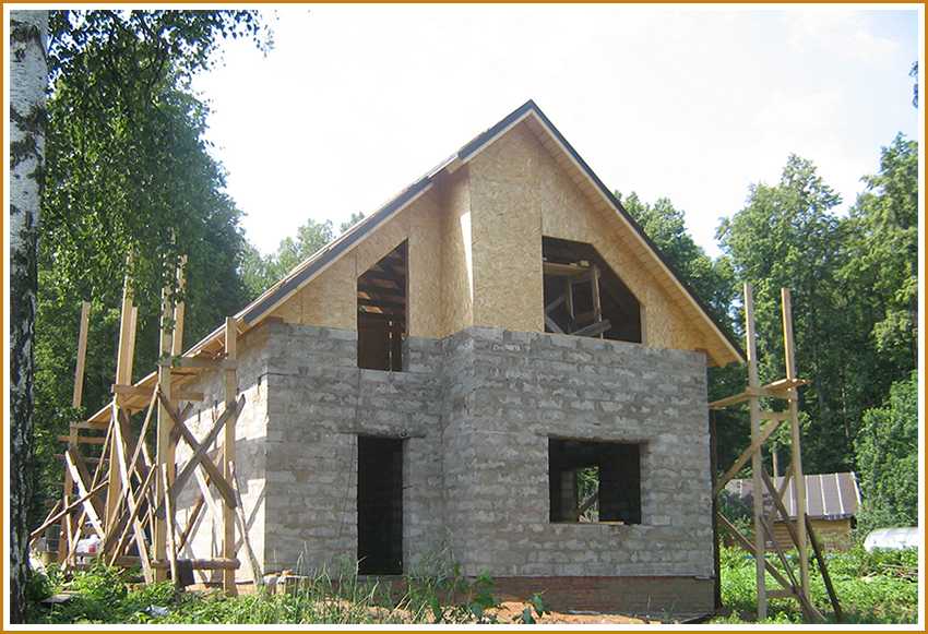 Собрать ее можно из досок или плит ОСП. После установки опалубки закладывают каркас, затем все это заливают бетоном, плотность которого должна быть выше 2000кг/м3. Продолжать стройку, стоит по прошествии месяца полтора.