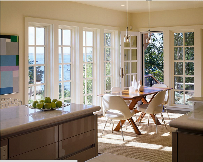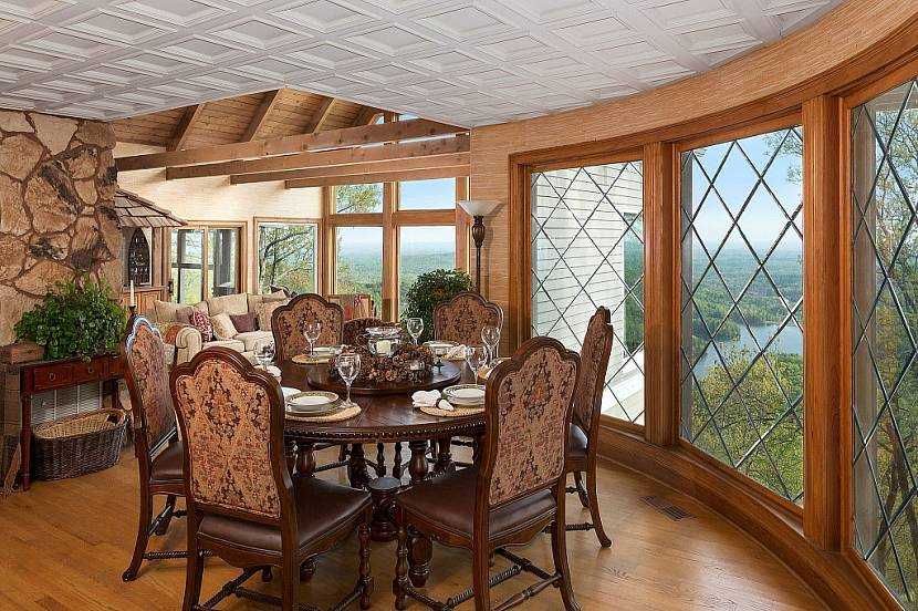 Окна от потолка до пола часто используют для обеденной зоны. Красивый пейзаж за окнами дополнит трапезу, хорошая освещенность позволит обойтись без искусственной подсветки в светлое время суток.