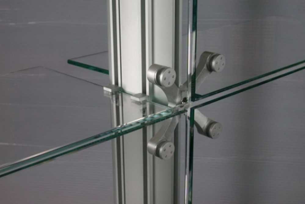 Особенностью спайдерной конструкции является в применении кронштейнов нестандартной формы. Они имеют в форму «паука» и изготовляются из нержавеющей стали. Далее, используя эластичные зажимы фиксируют элементы остекления на оптический клей.