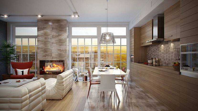 Кухня гостиная с французскими окнамиИсточник arxip.com