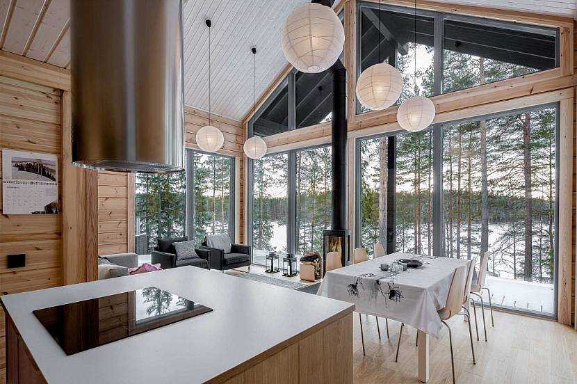 Используя двери различных способов открывания можно добиться того функционала, который вам необходим. Деревянные дома с панорамными окнами встречаются нечасто. Дело в том, что древесина постоянно меняет размеры и обычные окна ставят в специальные обсадные коробки, которые компенсируют это движение. Если площадь окон очень большая, это может быть проблематичным. Если решение нашли, можно ставить деревянные или пластиковые окна. А чтобы белый пластик не смотрелся чужеродным, ставят рамы, ламинированные пленкой, которая имитирует древесину.