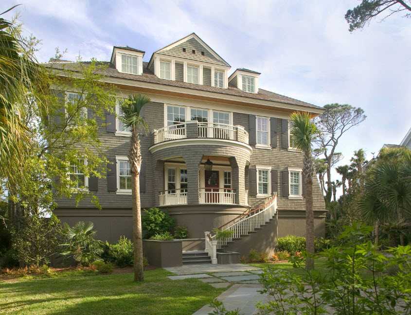 Постройки в григорианском стиле лишены декора, но зелень и плющ, увивающий кирпичный фасад дома, прекрасно спасает ситуацию. Фасад приобретает аккуратный вид благодаря низкому фундаменту, сдержанным оттенкам, а также крыше, покрытой черепицей. А вот изящный дымоход обычно каменный, в этом контрасте заключается непревзойденная особенность английской архитектуры. Что касается цвета, то предпочтение отдается темно-серой крыше и светло-серым стенам. Прекрасным дополнением станет деревянная терраса вокруг дома, с которой будет открываться замечательный вид на лужайку или пруд. Эффектно выглядят постройки из красного кирпича, которые напоминают нам замки сказочных героев.