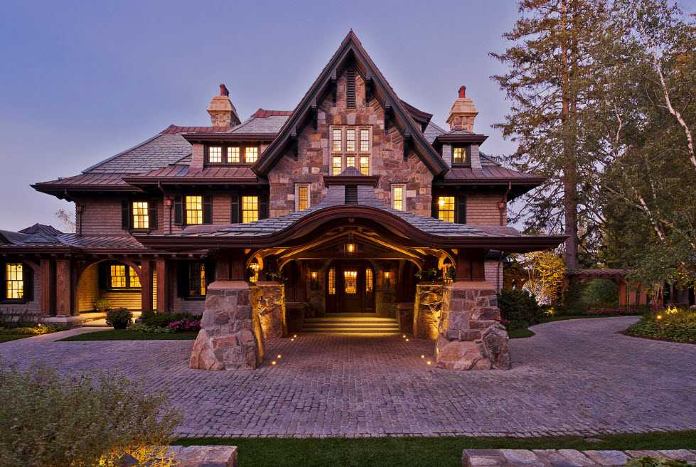 В большинстве случаев домики в английском стиле изготавливают из камня, внешне они очень массивны, а период их эксплуатации не ограничивается временем. Фасад частного дома в английском стиле всегда очень большой, для отделки используют штукатурку или кирпич. Постройки имеют элегантный дизайн, ведь в них соединяется фундаментальная мощь, изысканная утонченность и точность, благородство и роскошь. Изначально может показаться, что смотришь не на английский домик, а настоящий средневековый дворец, который одновременно манит к себе своим величием и отталкивает холодом мощных стен.
