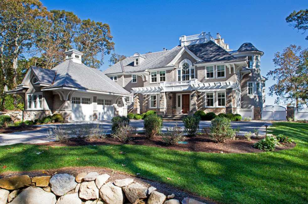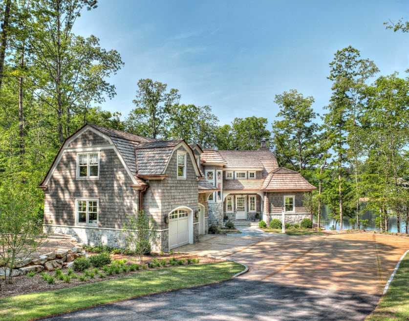 Обязательным условием является соблюдение пейзажных традиций и создание эффекта нетронутой человеком природы. Большие загородные особняки прекрасно дополнит ровная тротуарная плитка, встроенный гараж и аккуратно подстриженные деревья.