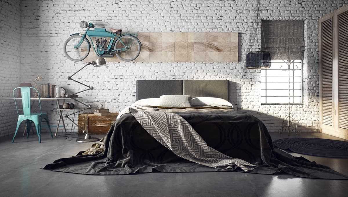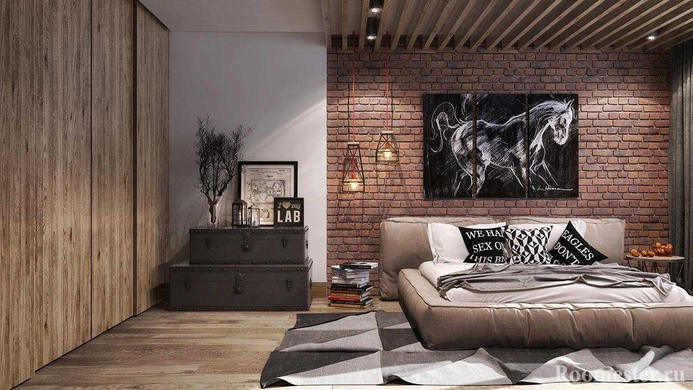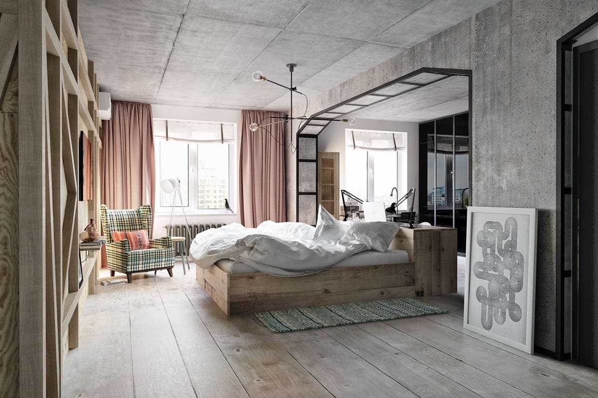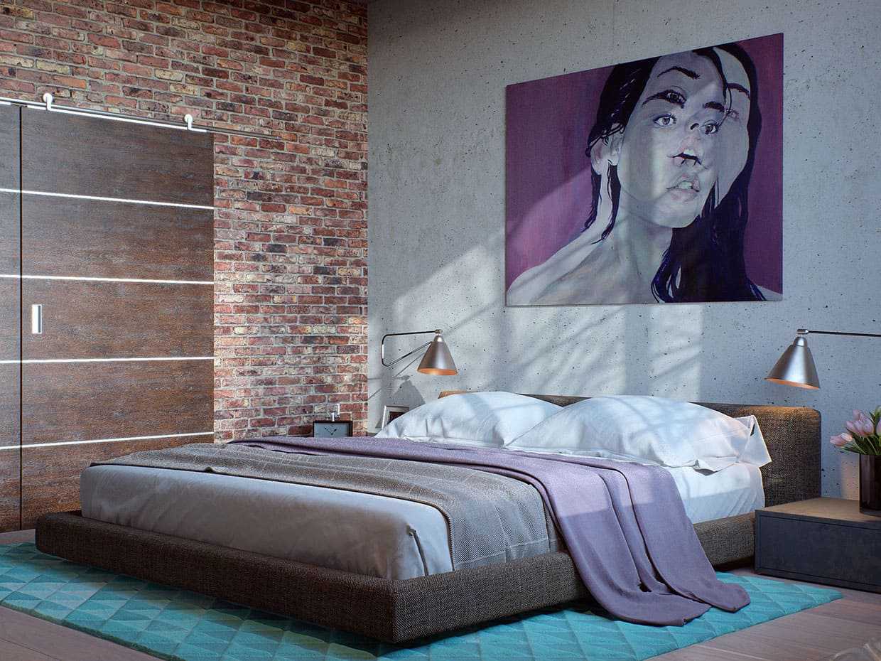 Подобный интерьер спальни прекрасно подойдет для поклонников лофт-минимализма