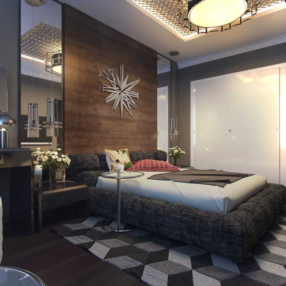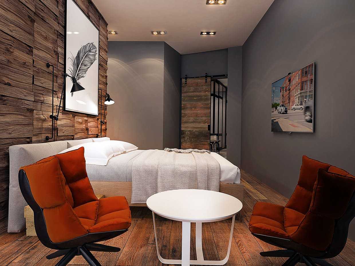 Стены в спальне лофт, выдержанные преимущественно в темных тонах, придают помещению элегантный и современный вид