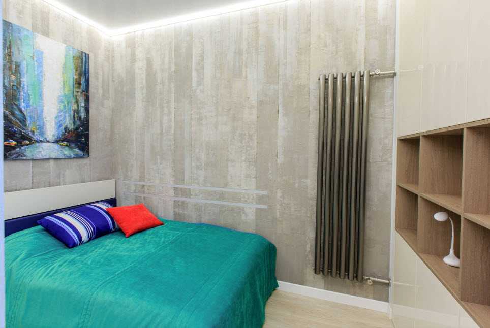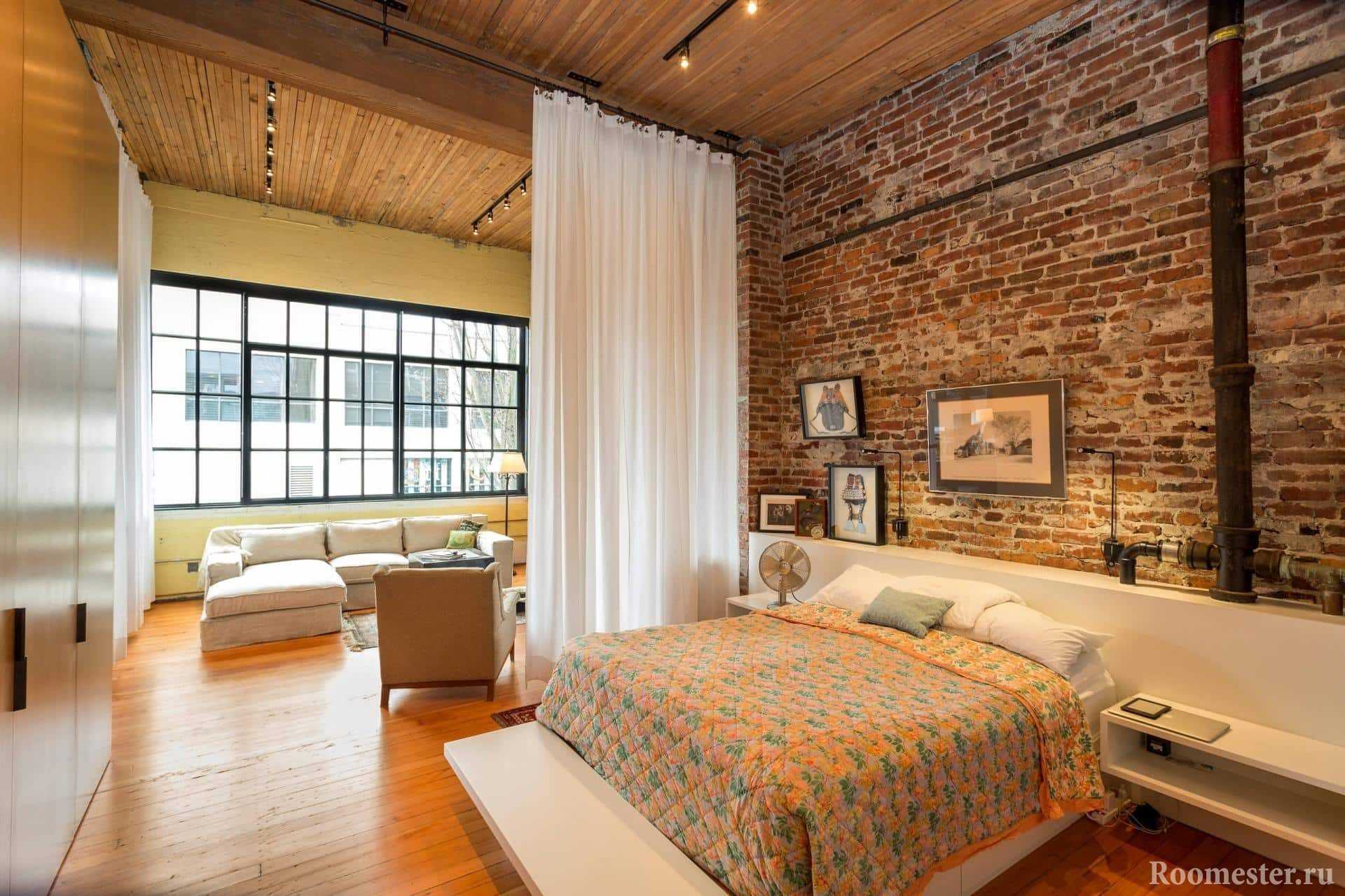 В зоне спальни обычно ставится металлическая кровать, присутствует очень сдержанный декор. Дополнительно разделить помещение на функциональные зоны помогут по-разному декорированные стены.