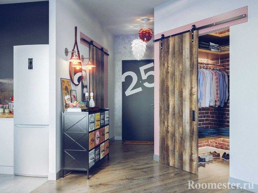 Наверняка, в такой квартире остались кирпичные или бетонные стены, что и нужно для этого стиля. Их просто оставляют так, как есть. Если такой вариант кажется совсем неуютным, то можно отштукатурить стены прихожей.