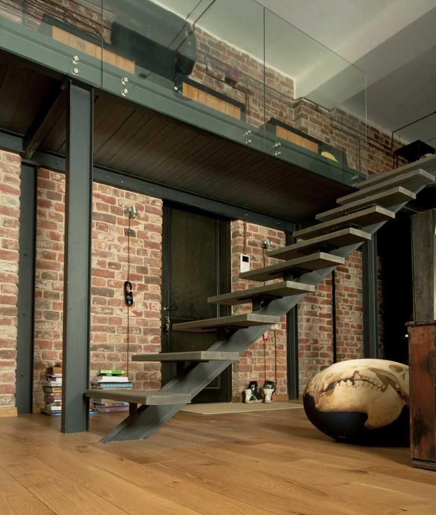 Интересно выглядят лестницы, где проступи крепятся на жесткие металлические опоры, давая полное ощущение ложной нестабильности и визуальный эффект того, что лестница подвешена прямо в воздухе. Есть смельчаки, которые устанавливают лестницы из стекла. Хрупкие они только с виду, на самом деле выполнены из прочного материала и выглядят более чем оригинально. Деревянные лестницы, чаще всего, искусственно состаривают методом патины и окрашивая в темные цвета, словно ею уже пользовались заводские рабочие. В качестве перил могут использоваться канаты, деревянные брусья, трубы и многое другое.