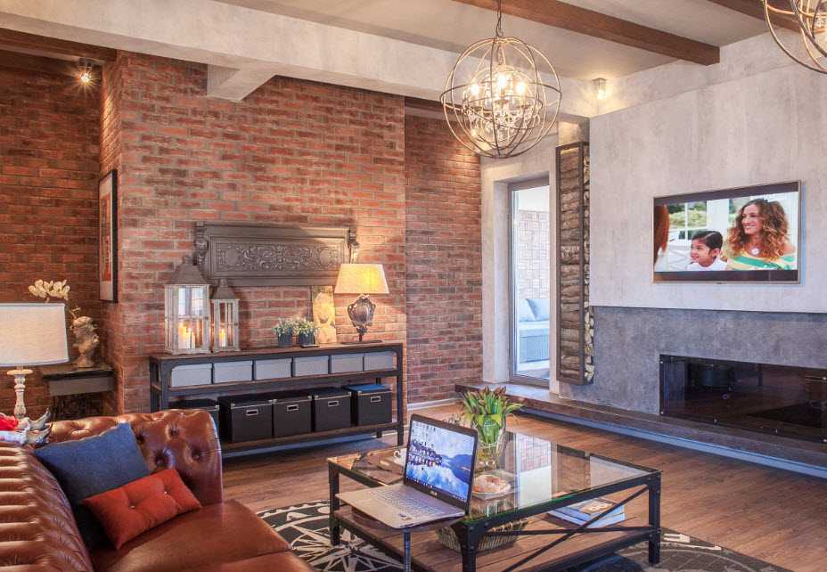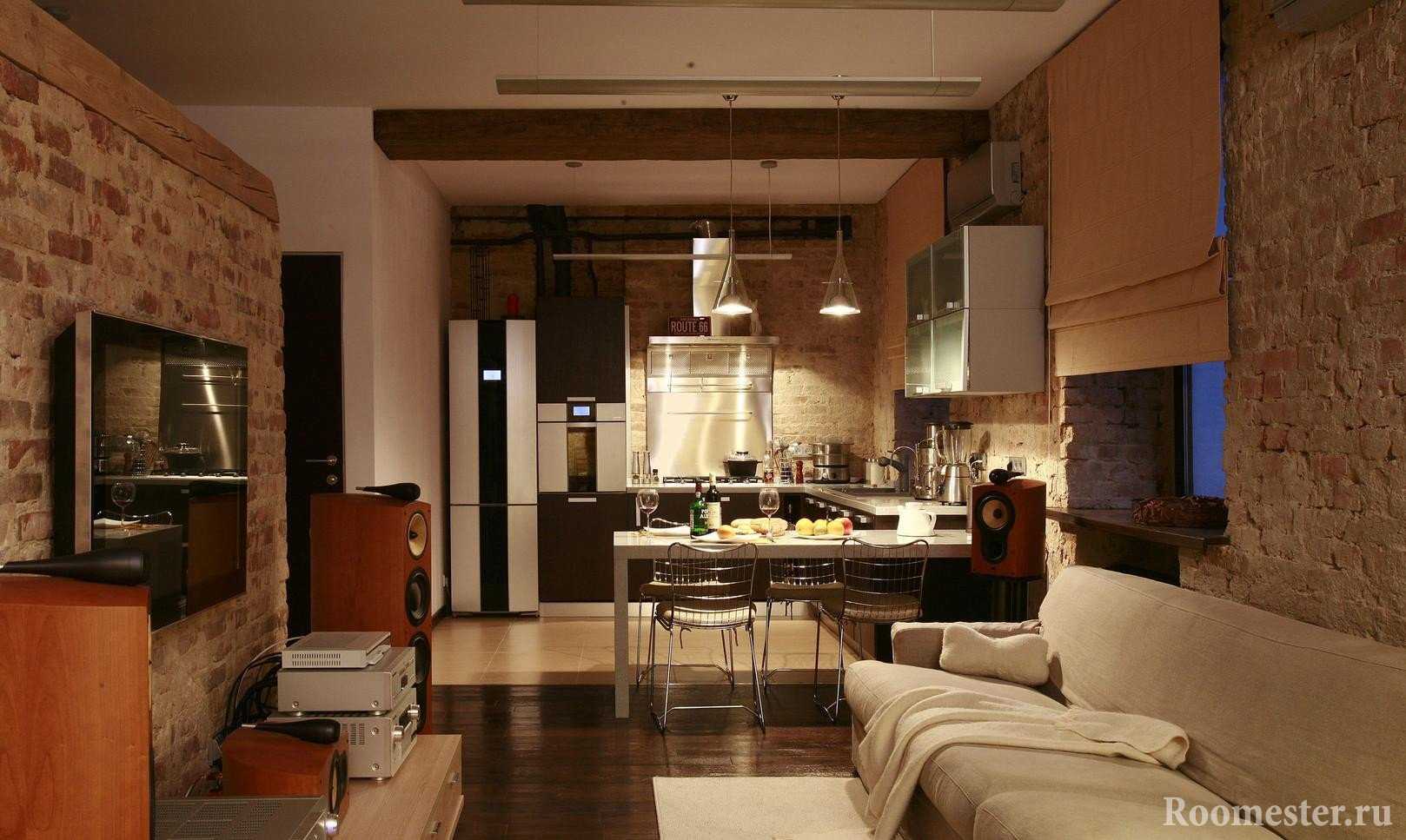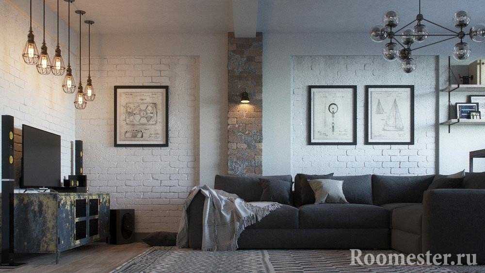 Одна кирпичная стена поможет выделить стиль лофт. Для отделки остальных стен можно использовать однотонную краску. Для того, чтобы создать соответствующий дизайн, можно использовать специальные обои, имитирующие кирпичную кладку. На потолки можно установить плафоны, а можно люстру из хрусталя. В обстановку идеально впишутся раритетные торшеры, лампы.