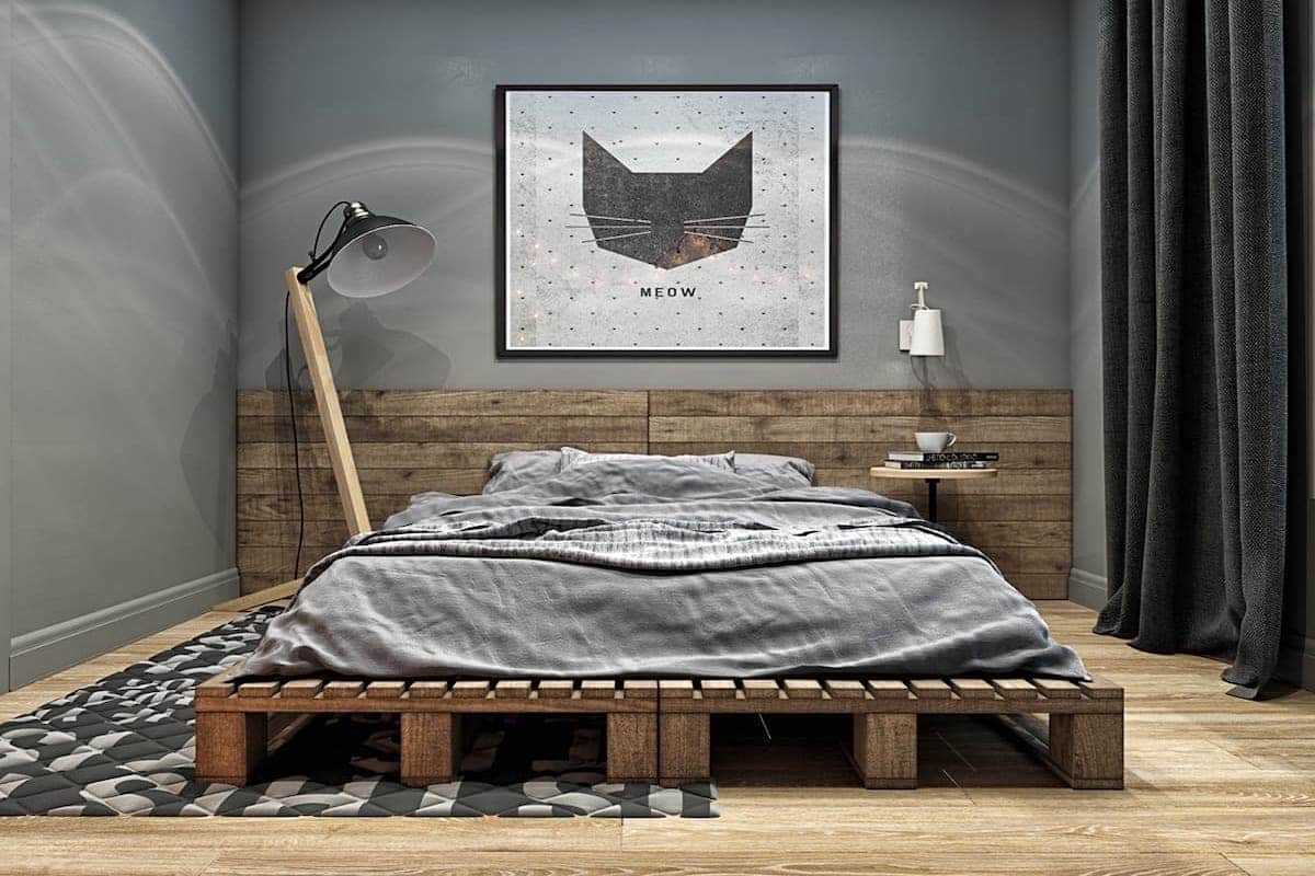 Для того, чтобы подчеркнуть нужный стиль интерьера, необходимо выбрать соответствующую кровать. Она должна иметь простую лаконичную форму, деревянный или металлический каркас из стали. Около кровати можно поставить тумбочки или ящики, куда можно складывать вещи. Кровать украшается однотонным покрывалом.