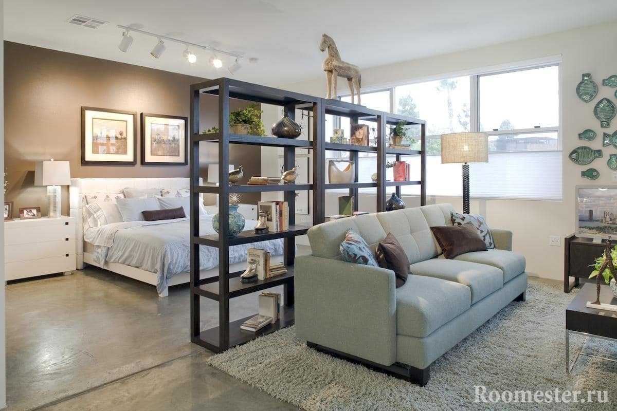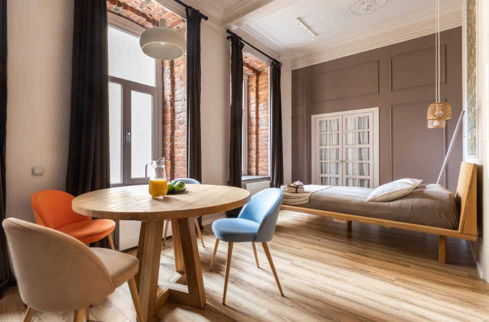 Оно исключительно визуальное и заключается в цветовом разделении. Это значит, что, например, зона сна будет оформлена в одних тонах и стиле, рабочая зона в других, а гостевая в третьих. Это создает иллюзию многокомнатной квартиры, но при этом каждая «комната» смотрится больше за счет отсутствия стен.