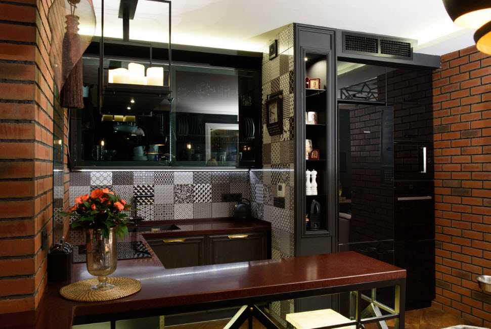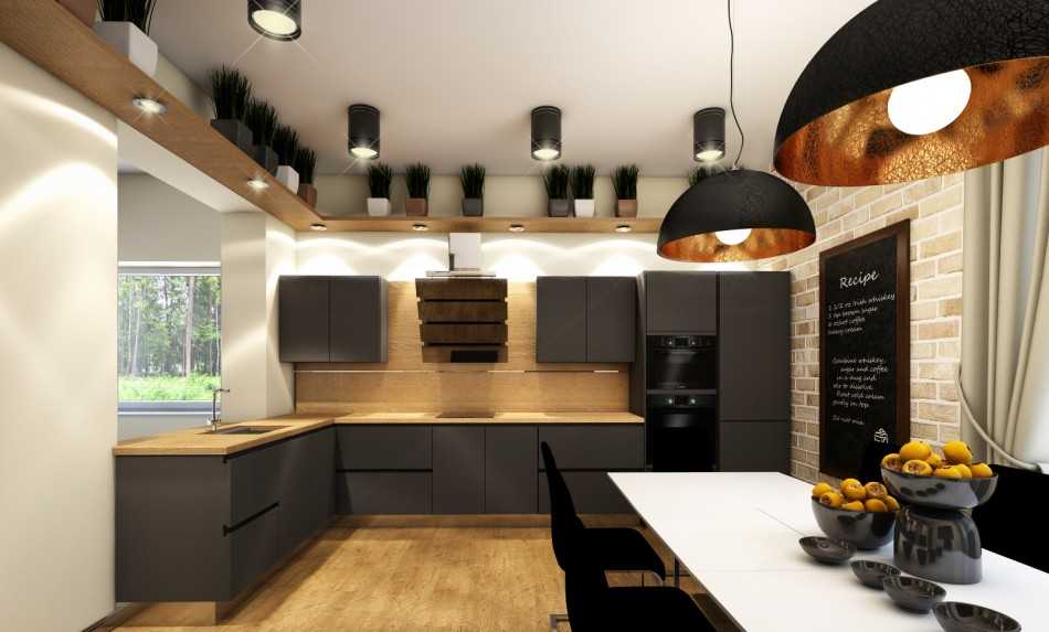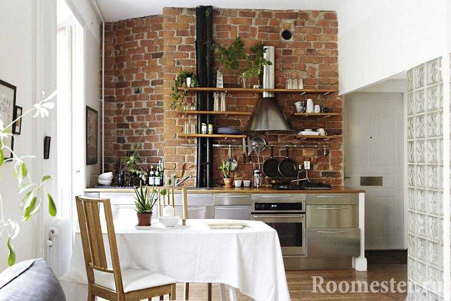 Гладкие или кирпичные стены на кухне остаются классикой жанра, которая подходит всем помещениям. Если нет возможности выкладывать стену настоящим кирпичом, то в качестве отделки можно использовать искусственные материалы, дизайн от этого не пострадает. Деревянные или металлические балки на потолке придадут индустриальный вид. На кухне потолки также можно покрыть штукатуркой.