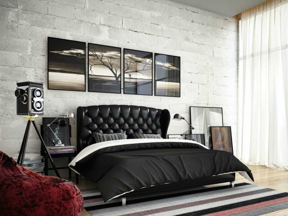 В интерьере спальни хорошо будет смотреться как современный плазменный телевизор, так и старый телефонный аппарат. Стены украшаются черно-белыми фотографиями или постерами.