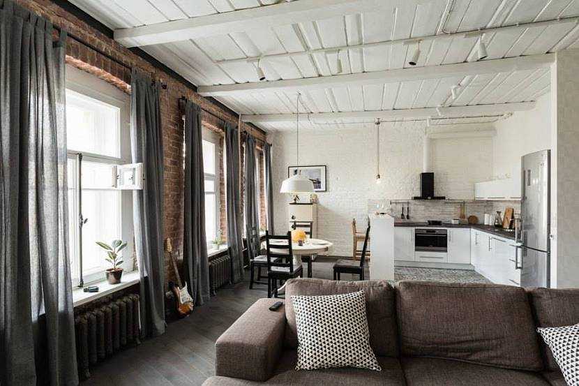 Поэтому можно оставить одну необработанную стену, а остальные покрыть штукатуркой или закрасить. Бетонные балки на потолке создадут индустриальный вид. Их можно приукрасить белой краской. Не стоит ремонтировать неидеальный потолок, он только будет способствовать созданию нужной атмосферы.
